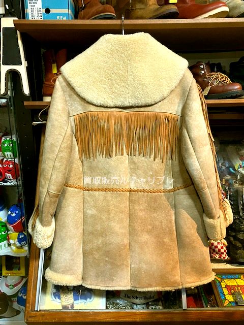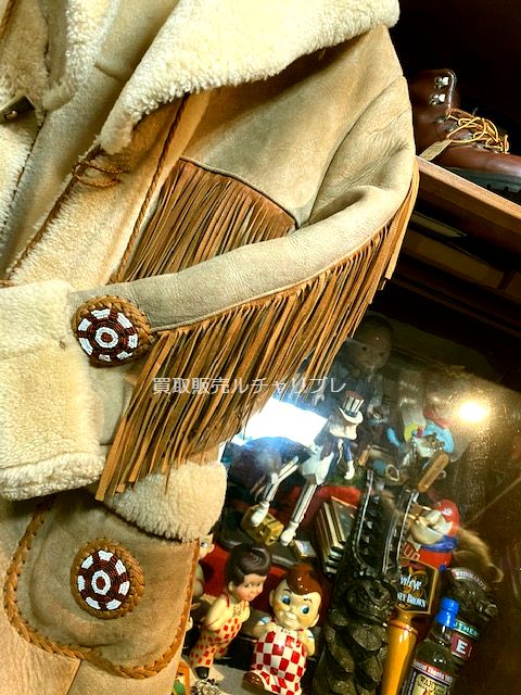 毛足の長い肉厚のムートンを使用したネイティブデザインのコートです。 胸、背中と両腕にフリンジが付き、ポケットや袖口付近にはビーズ細工が施されています。