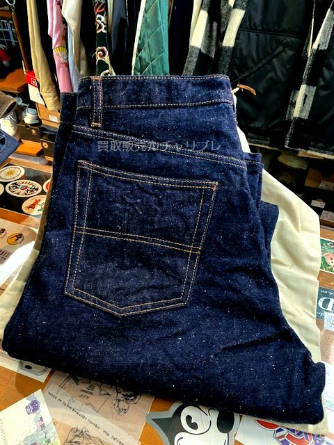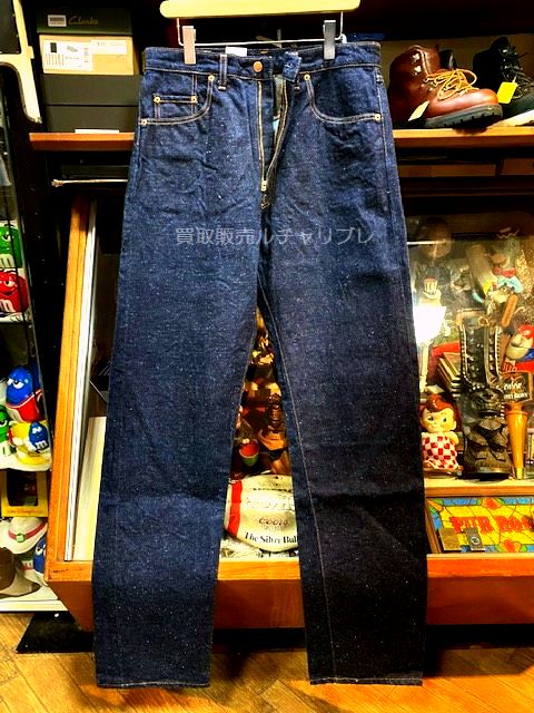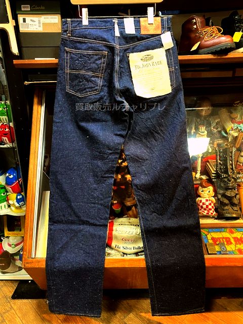 「世界一のジーンズを」という構想から10年の開発期間を経て1980年から発売された“RARE JEANS/レアジーンズ”シリーズのR-001。 セルビッチは幅広で金ミミ仕様。 フロントジップはTALON製を、リベットにはBIG JOHNの刻印が入った銅製のSCOVILLを使っています。 バックヨークの内側に手書きサインが入り、スレーキにはシリアルナンバーがスタンプされています。 保存袋もあり、レングスカットもしていない完全デッドストック品。