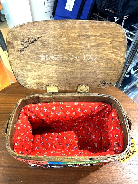 1950年代から1970年代までの間、アメリカのミシシッピでハンドメイドによって製作されていたCaro nan basket/カロナンバスケット。 カロリン・マクダニエルズとナンシー・スティールの二人の女性の名前から付けられたブランド名です。 お買取りさせていただいたバックの周囲には街並みがペイントされた人気のトラベルシリーズ。 蓋にはフクロウ、キノコ、テントウ虫、汽車?がペイントされ、蓋の裏にはCaro nanのサインと発注・販売されたショップの名前があります。 製昨年を表す蓋に取り付けられたペニーコインは1975年製。 ペイントの剥がれもなく、タグも付いたままのデッドストック美品。