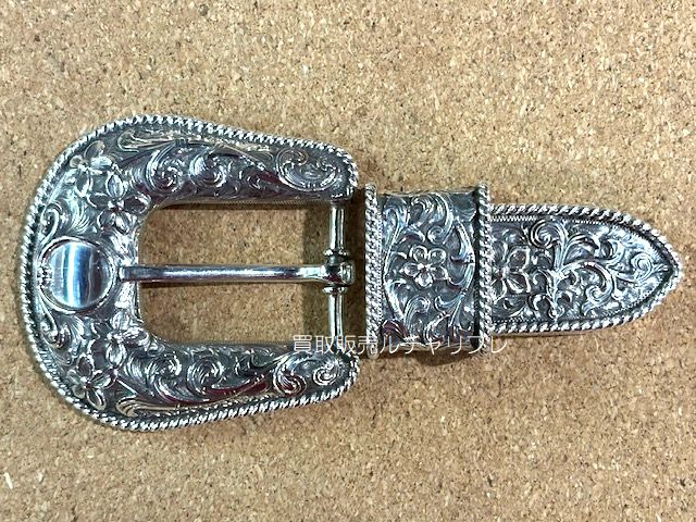 現社長「Chet Vogt氏」の名前が全てのパーツに入ったシグニチャーシリーズの3ピース バックルセット。 エングレイビング、ロープエッジ、オーバーレイなどの技法が施されています。 バックル・ベルトループ・チップ全てに「Chet Vogt」のロゴが入りますが、バックルだけは手描きのようなサインになっています。