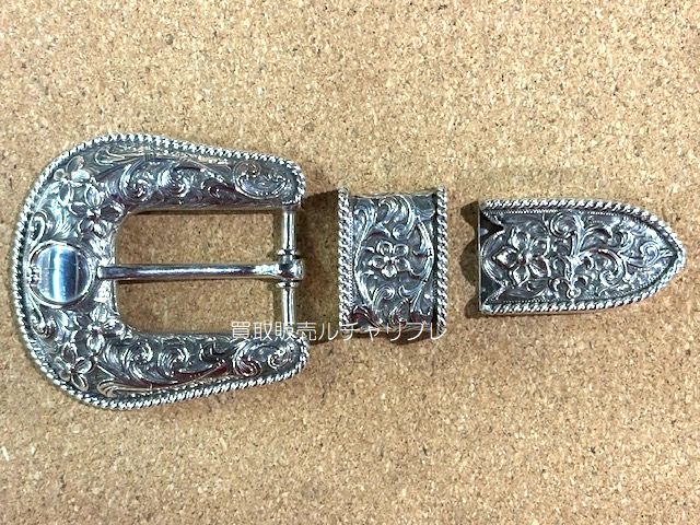 現社長「Chet Vogt氏」の名前が全てのパーツに入ったシグニチャーシリーズの3ピース バックルセット。 エングレイビング、ロープエッジ、オーバーレイなどの技法が施されています。 バックル・ベルトループ・チップ全てに「Chet Vogt」のロゴが入りますが、バックルだけは手描きのようなサインになっています。