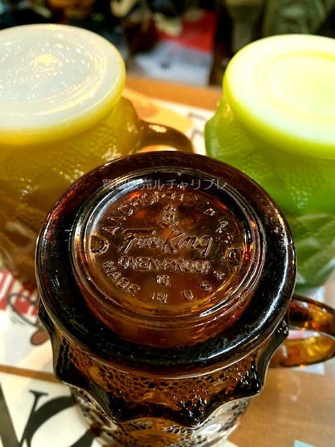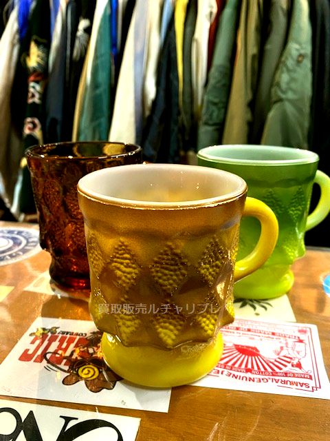 アンカーホッキング社製ファイヤーキングのKIMBERLY/キンバリーは、アフリカの都市からつけられた名前とダイヤをモチーフにした菱形のデザインにくびれた足があるのが特徴のマグです。 以前にもお買取させていただいていたイエローとグリーンに新しくアンバー(琥珀色)の3つをお買取させていただきました。 “OVEN-PROOF”スタンプの1960年代中頃~1970年代中頃品。 他にも多数、ファイヤーキング以外もお買取させていただいています。