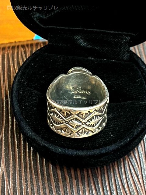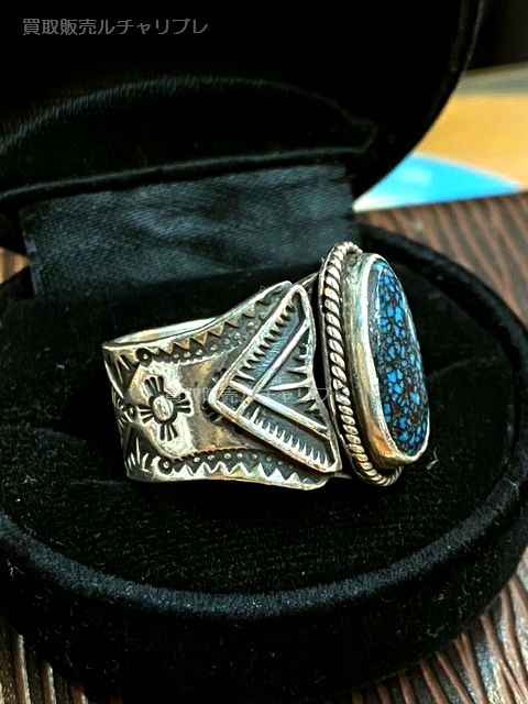 ターコイズの中で一番高価で希少なLander Blue Turquoise(縦16×9mm)がセットされた「故Gary Reeves/ゲーリーリーブス」のスタンプワークリングです。