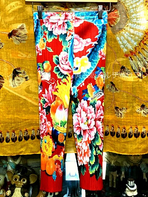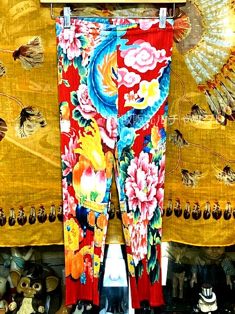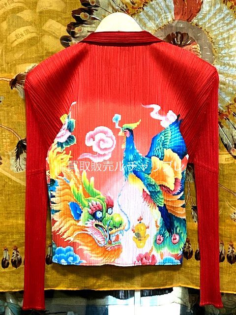 “ISSEY MIYAKE イッセイミヤケ”の人気シリーズ“PLEATS PLEASE プリーツプリーズ”のセットアップです。 1998年春夏コレクションのカタログに掲載された人気の“CHINESE NEW YEAR DRAGON”シリーズ。 1998年に新年を祝うモチーフとして発表された縁起の良い龍や鳳凰などがデザインされたブラウスとパンツのセットです。