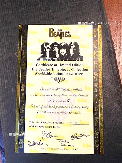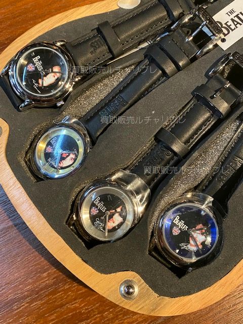 1996年に5000個限定販売された“THE BEATLES ビートルズ”の腕時計セットです。 木製のギター型ケースに腕時計が4つ入っています。 文字盤にはジョン・レノン、ポール・マッカートニー、リンゴ・スター 、ジョージ・ハリスンの顔がデザインされています。 シリアルナンバー入り。
